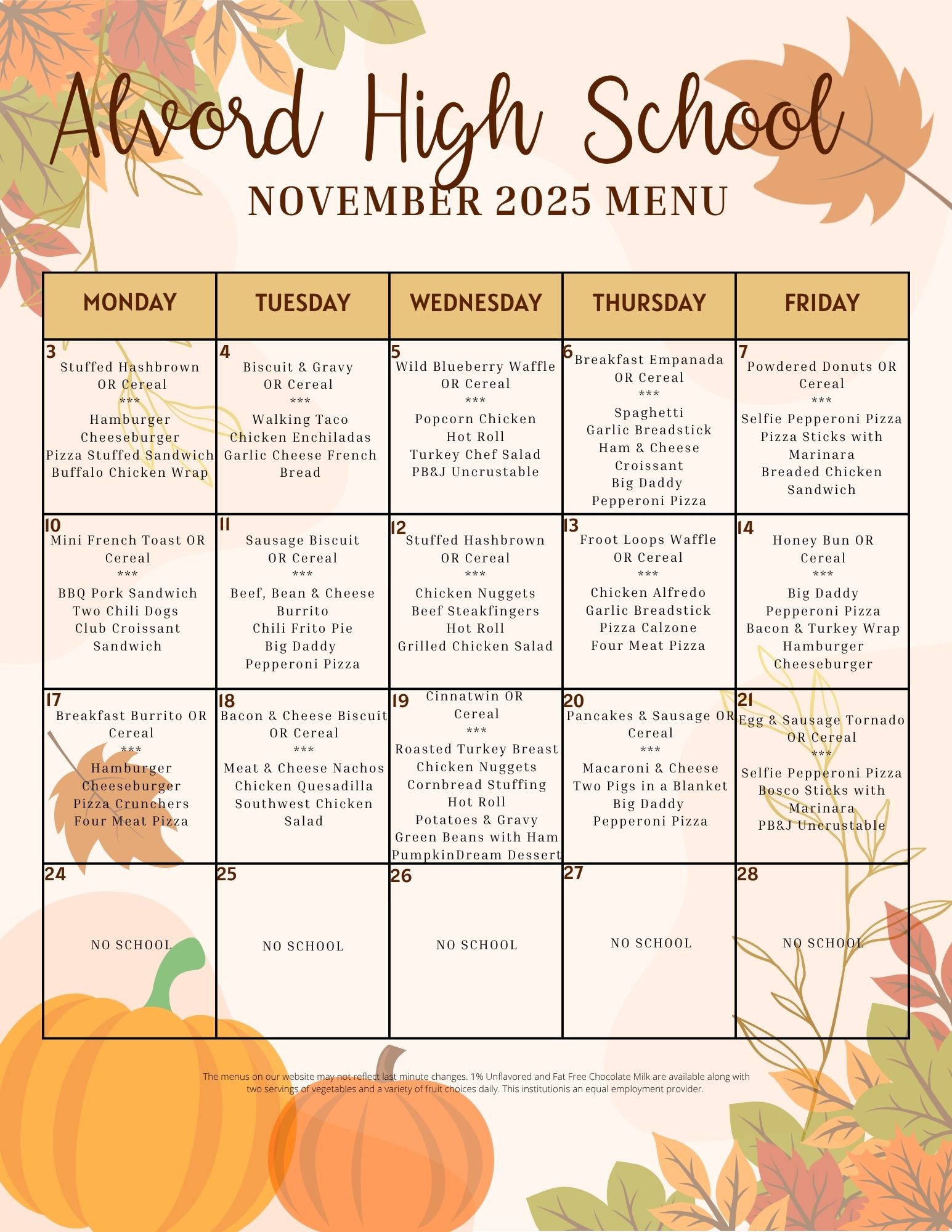 Welcome to the Alvord High School Lunchroom page. We look forward to serving our students a well balanced nutritional meal that meets the Texas Department of Agriculture's Texas Public School Nutrition Policy. Our cafeteria is offer vs. serve, which means that we offer at least five qualifying food items to each student and they may choose all or at least three and one being a fruit or vegetable for the tray to qualify for the state's nutritional guidelines.